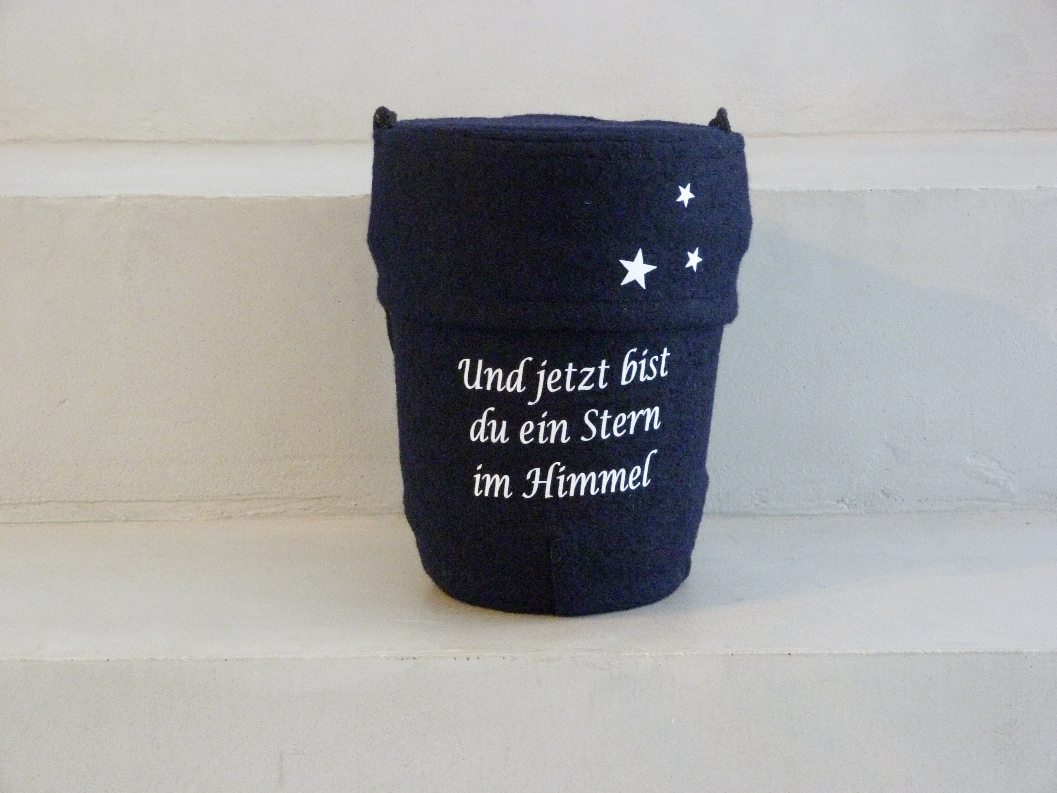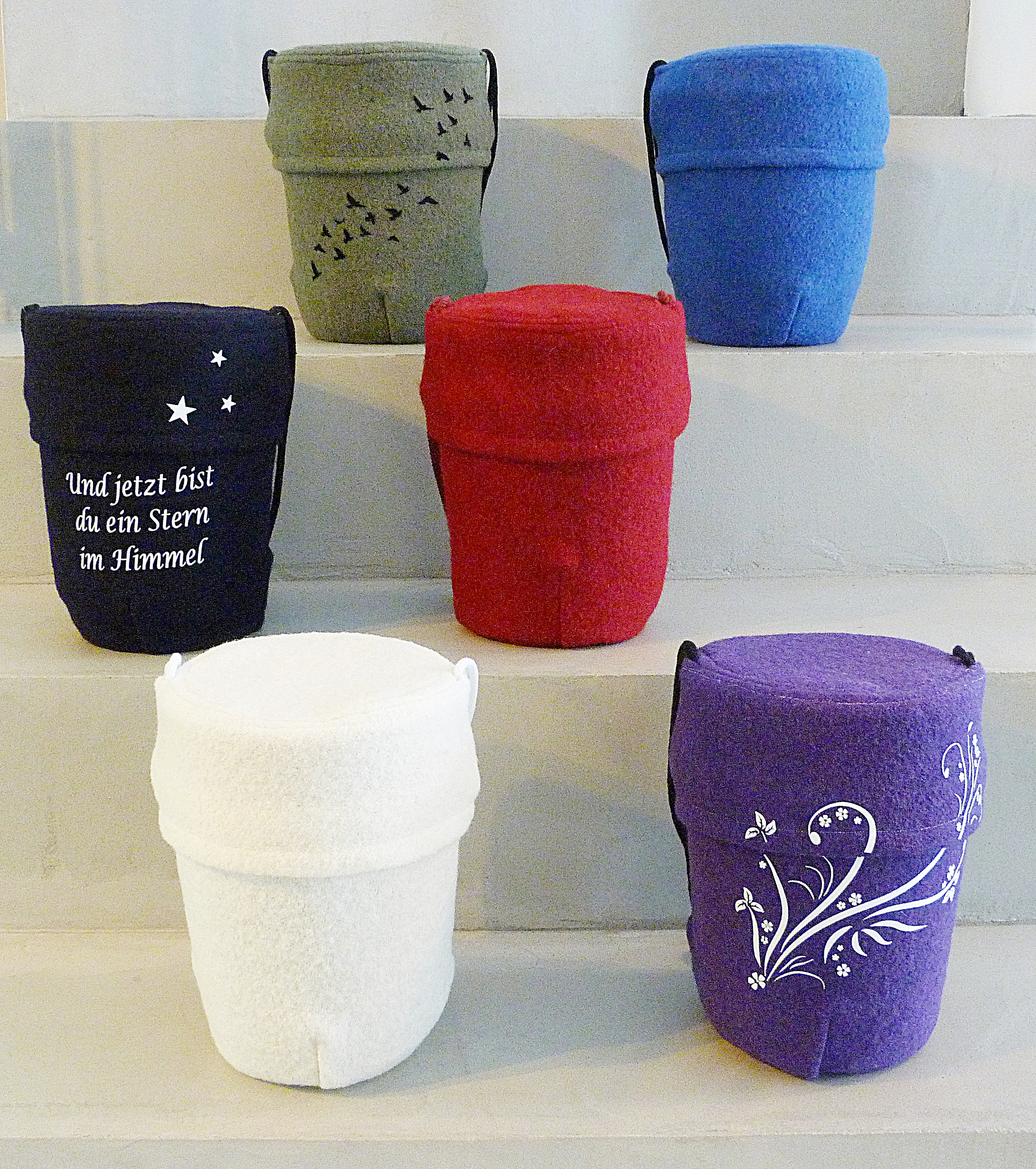 Die Möglichkeiten einer Filzurne sind fast unbegrenzt und jegliche Wünsche betreffend Gestaltung und Individualität werden von uns umgesetzt. Ob Sprüche, Symbole oder Fotos machen eine Filzurne zum persönlichen Begleiter auf dem letzten Weg.